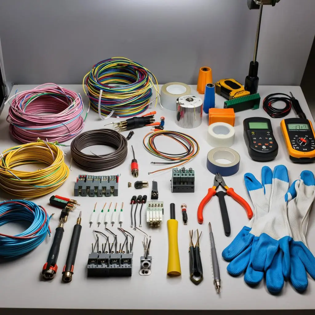 Изоляционные материалы (изоляционная лента, трубки, пленки);Проводники и кабели (силовые провода, установочные кабели, сигнальные линии);Крепежные элементы (винты, гайки, хомуты, зажимы);Защитные устройства (предохранители, автоматические выключатели, УЗО).